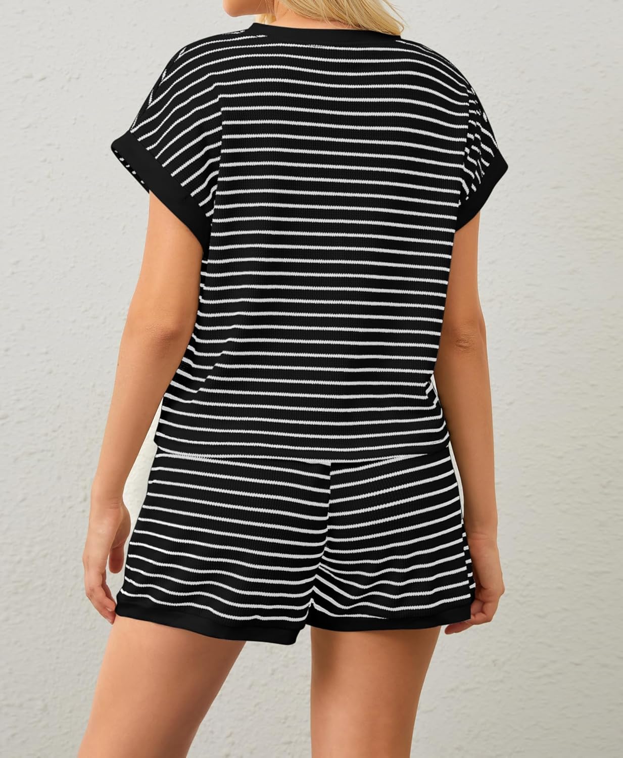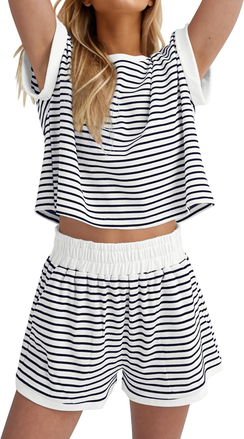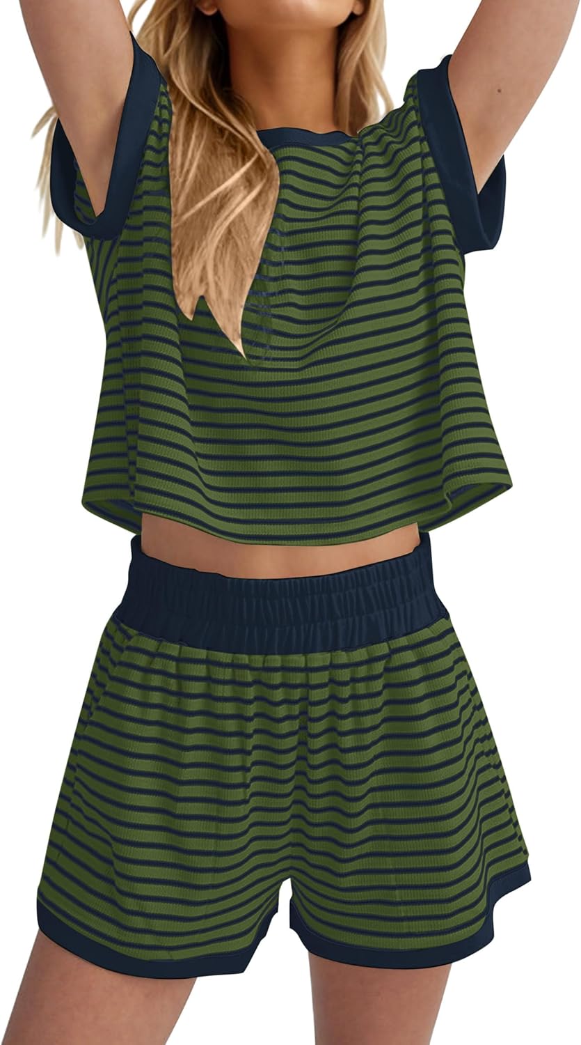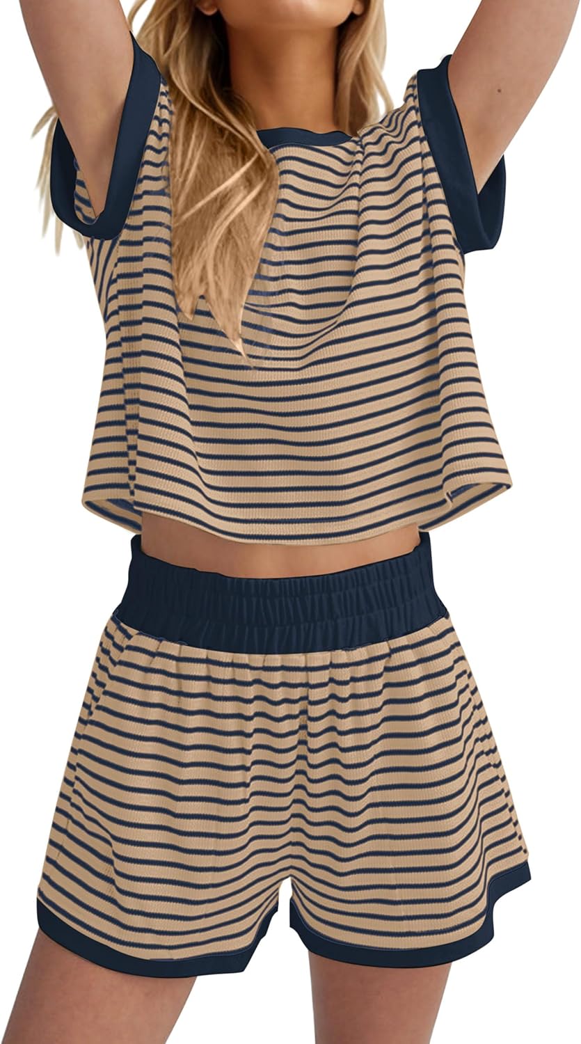 • Burtell Women Summer 2 Piece Lounge Sets Striped Short Sleeve Tee Shirts Mini Shorts Loungewear Shorts Set Ribbed Pajama Set