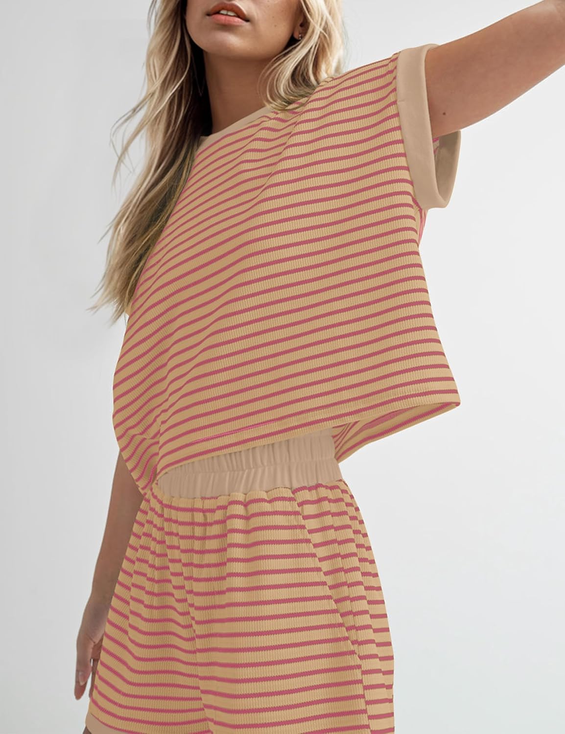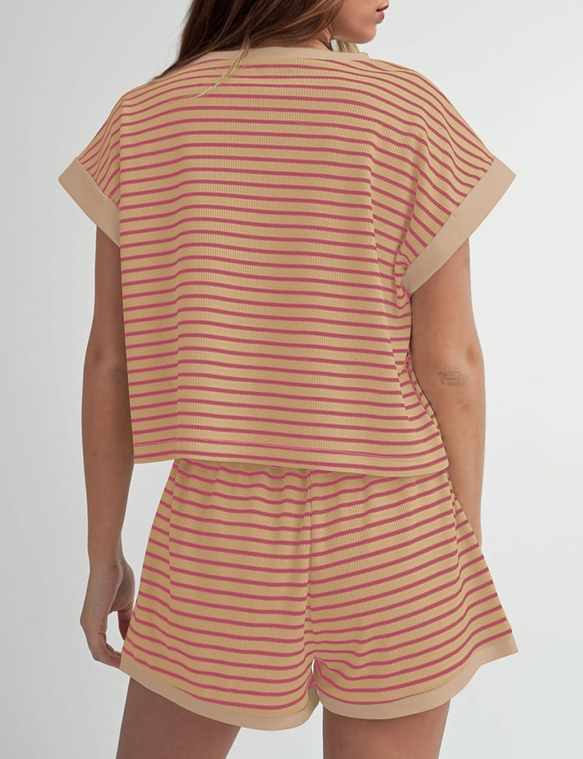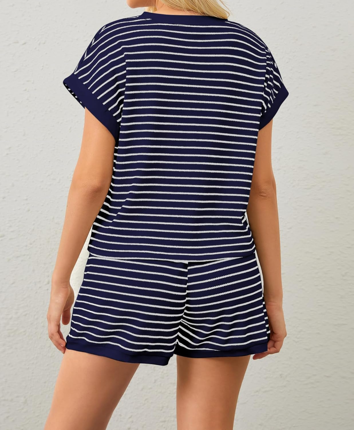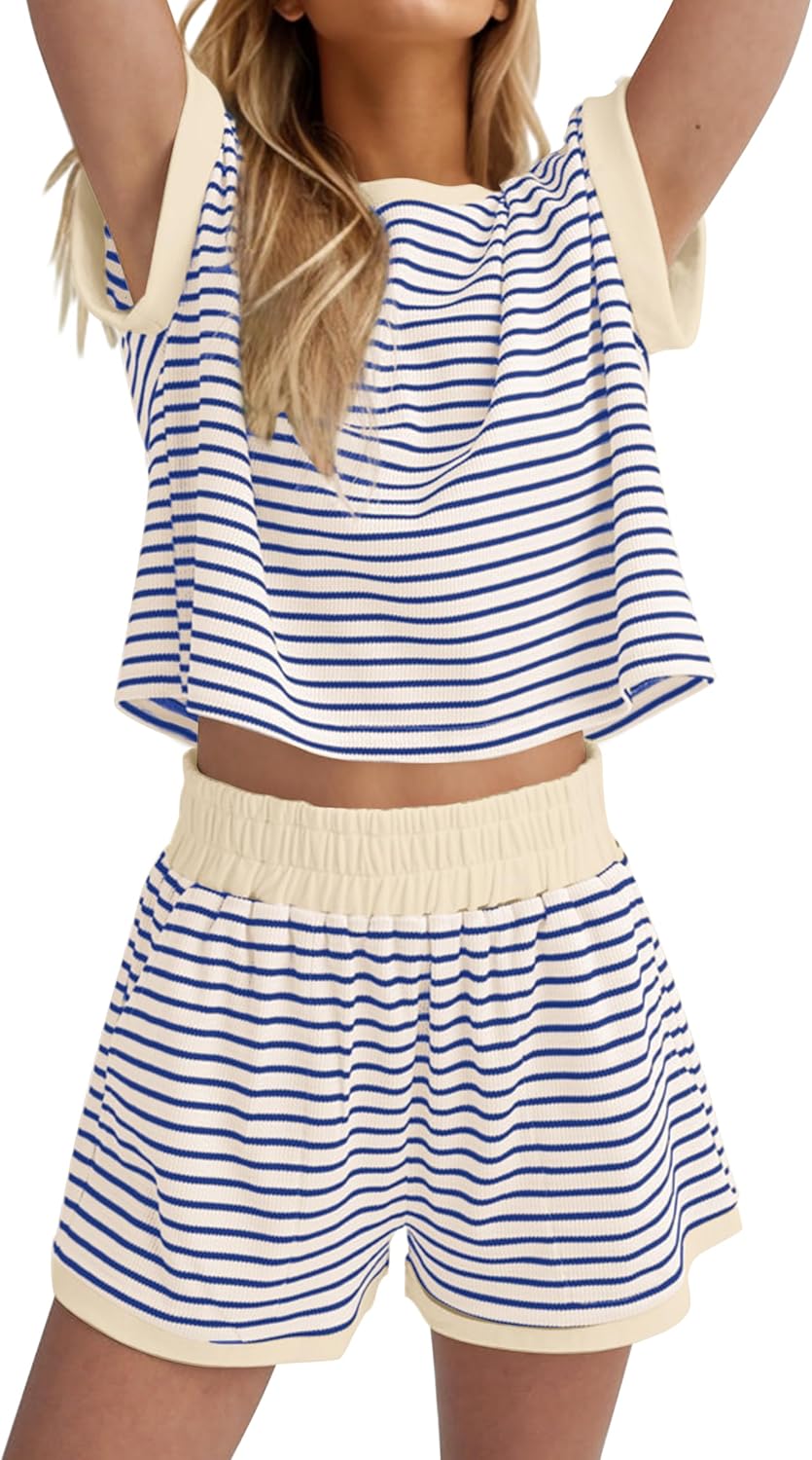 • Burtell Women Summer 2 Piece Lounge Sets Striped Short Sleeve Tee Shirts Mini Shorts Loungewear Shorts Set Ribbed Pajama Set