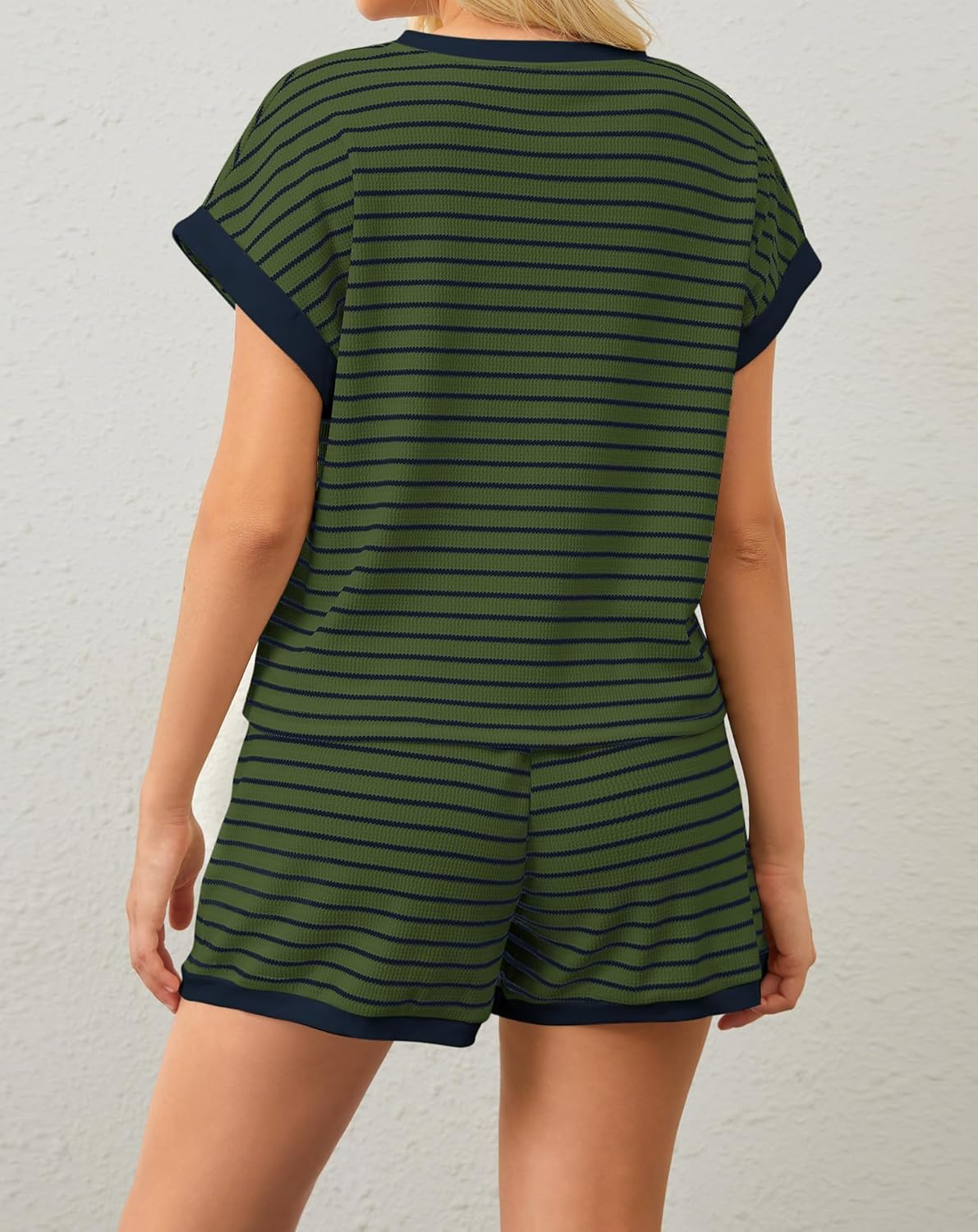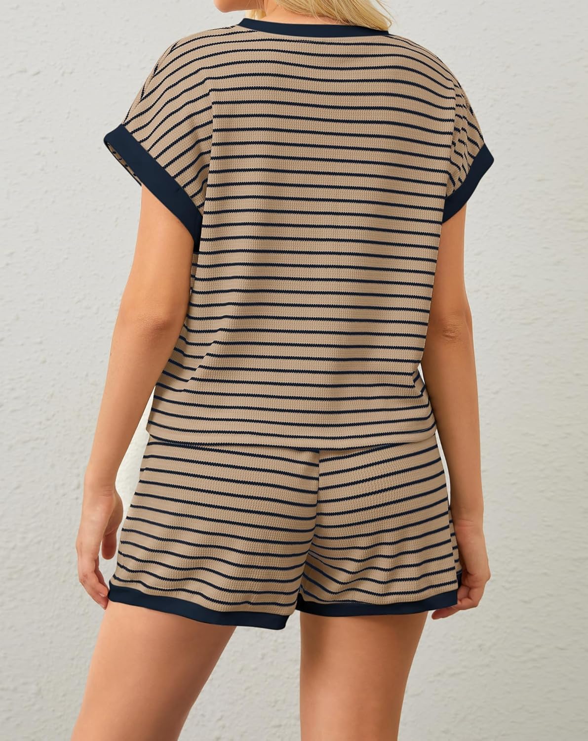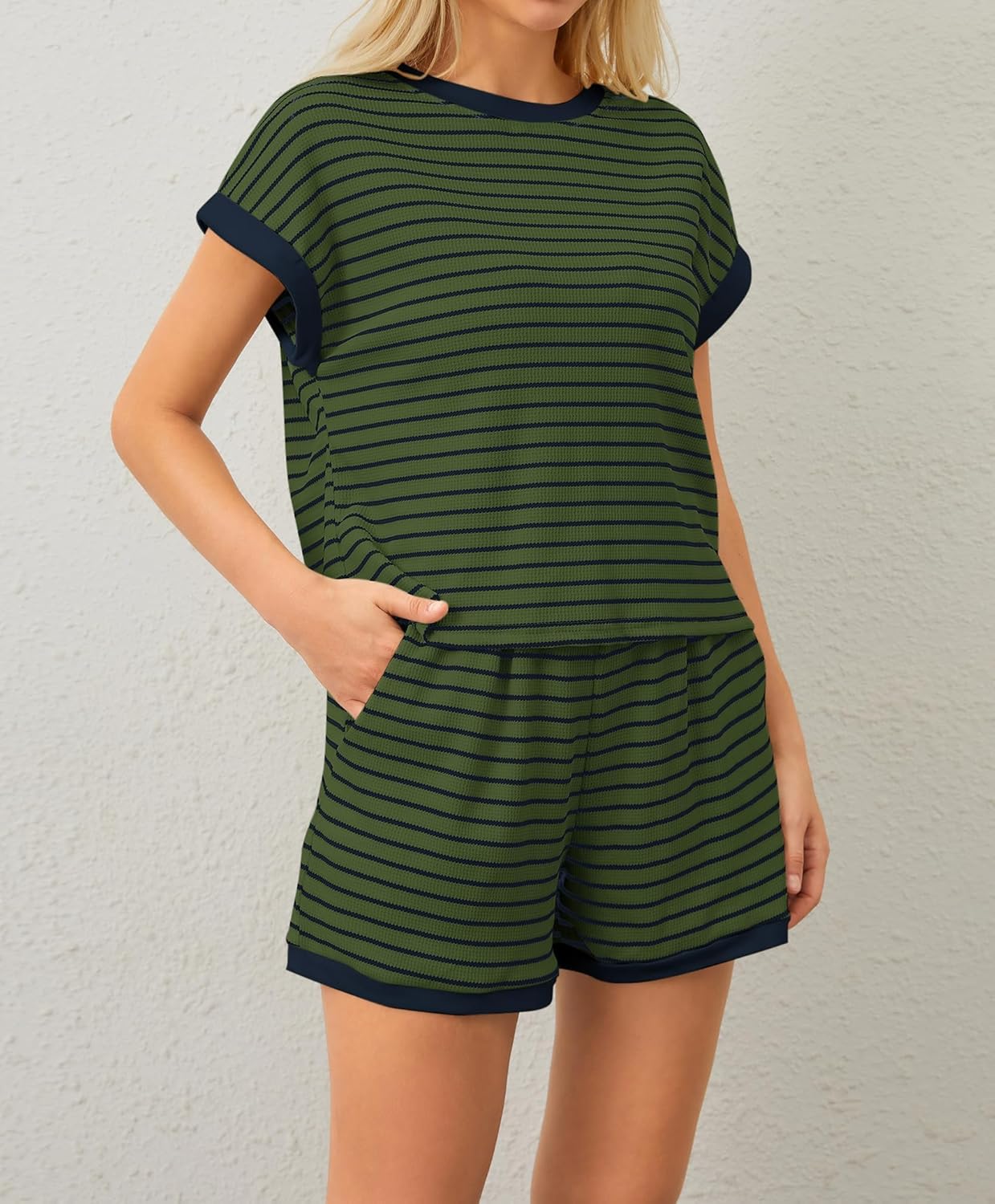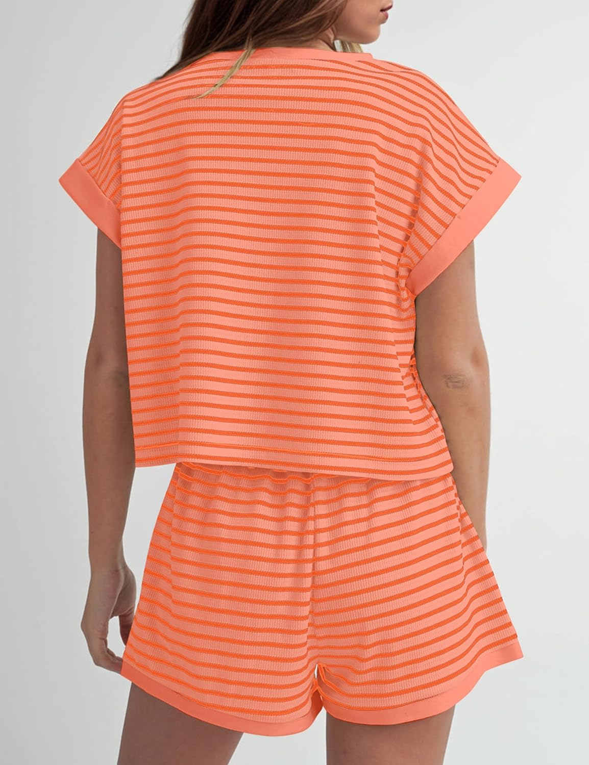 • Burtell Women Summer 2 Piece Lounge Sets Striped Short Sleeve Tee Shirts Mini Shorts Loungewear Shorts Set Ribbed Pajama Set