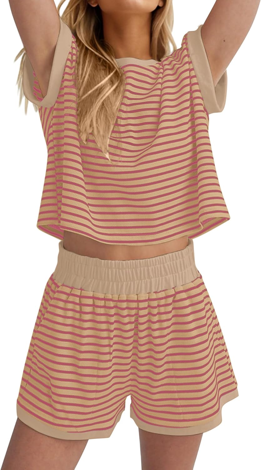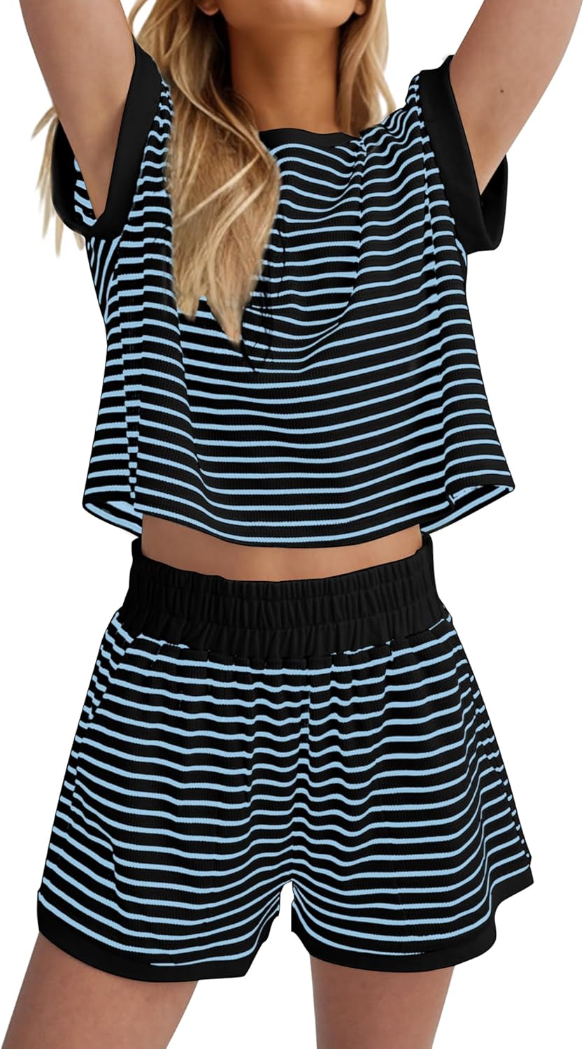 Burtell Women Summer 2 Piece Lounge Sets Striped Short Sleeve Tee Shirts Mini Shorts Loungewear Shorts Set Ribbed Pajama Set