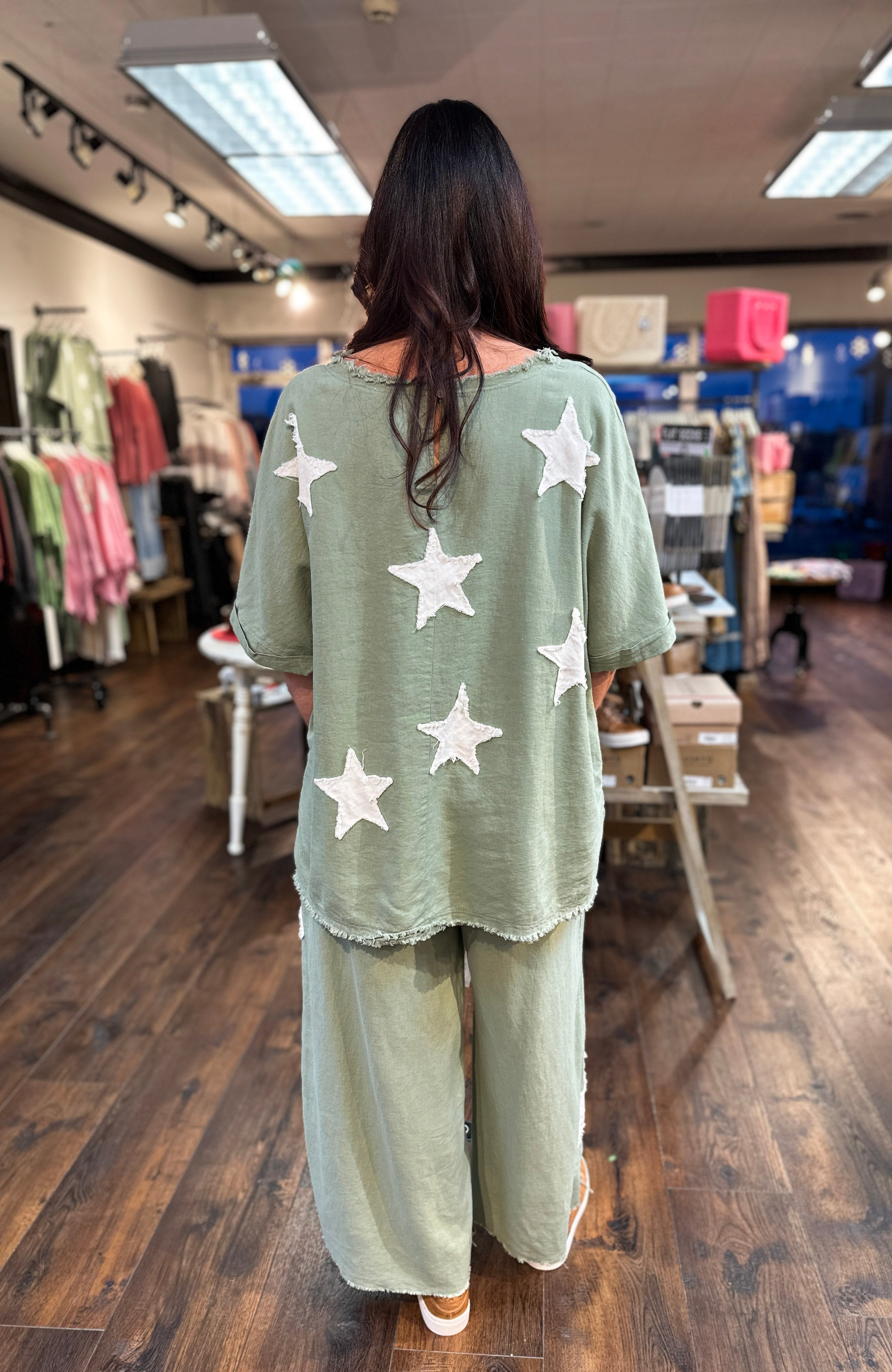 These are soooo cute and comfy! Linen blend material with star patches throughout, Side pockets and elastic waist band!